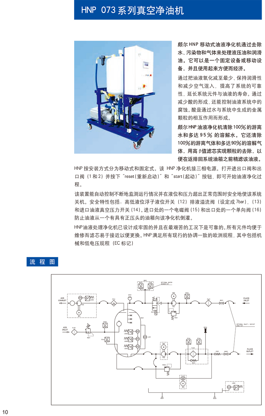 HNP073真空濾油機(jī)通過去除水、污染物和氣體來凈化油品。因?yàn)橛鸵貉趸?、?rùn)滑性能的喪失和空氣的混入直接影響系統(tǒng)的可靠性和系統(tǒng)元件及油液的使用壽命。HNP073真空濾油機(jī)去除100%的游離水和多達(dá)90%的溶解水。濾油機(jī)還能去除100%的游離氣體和多達(dá)80%的溶解氣體。顆粒的去除是在油液冋到系統(tǒng)油箱之前通過使用一個(gè)3μm的濾芯來處理該油液而實(shí)現(xiàn)的。對(duì)于高要求,可用一個(gè)1微米的濾芯。
